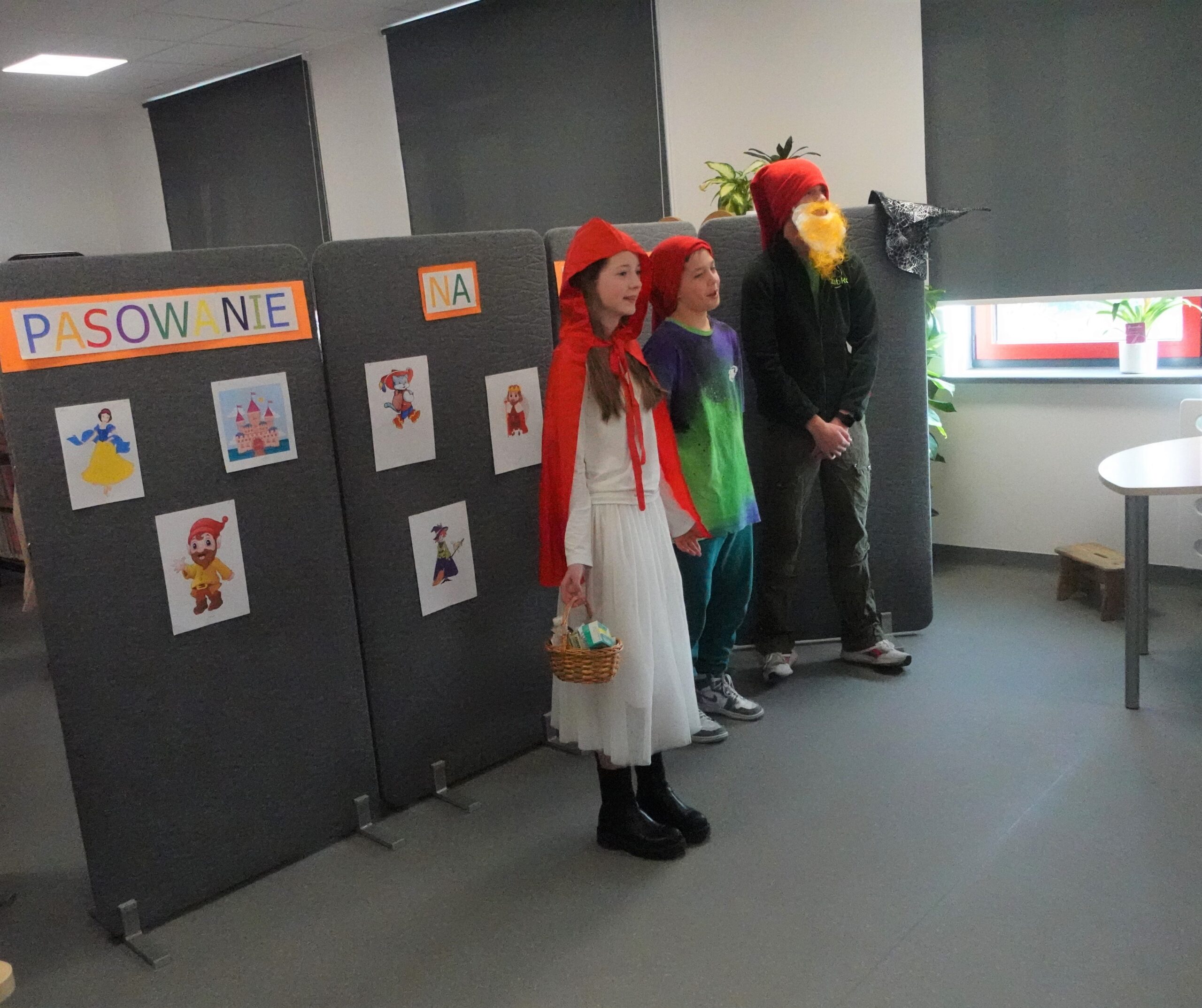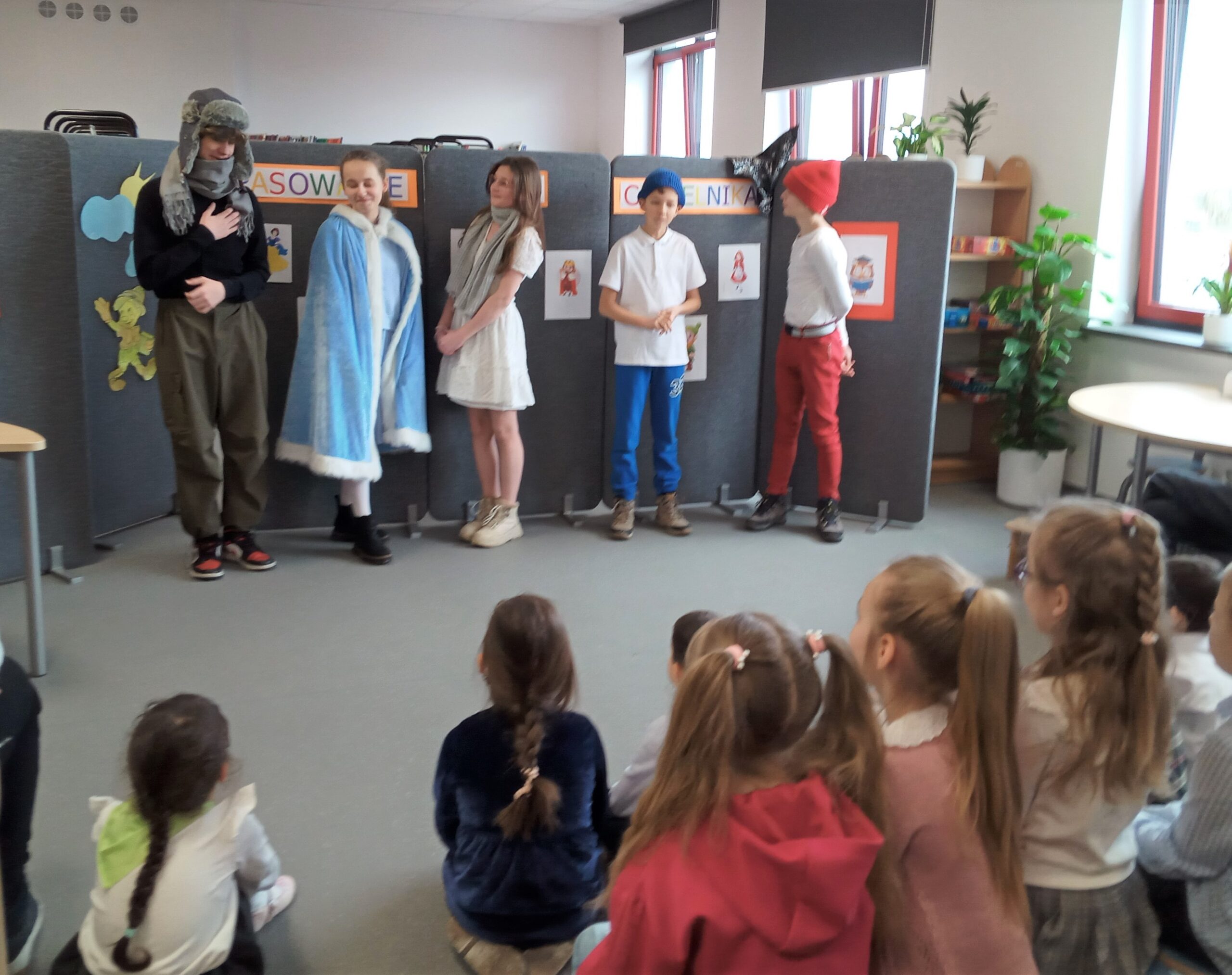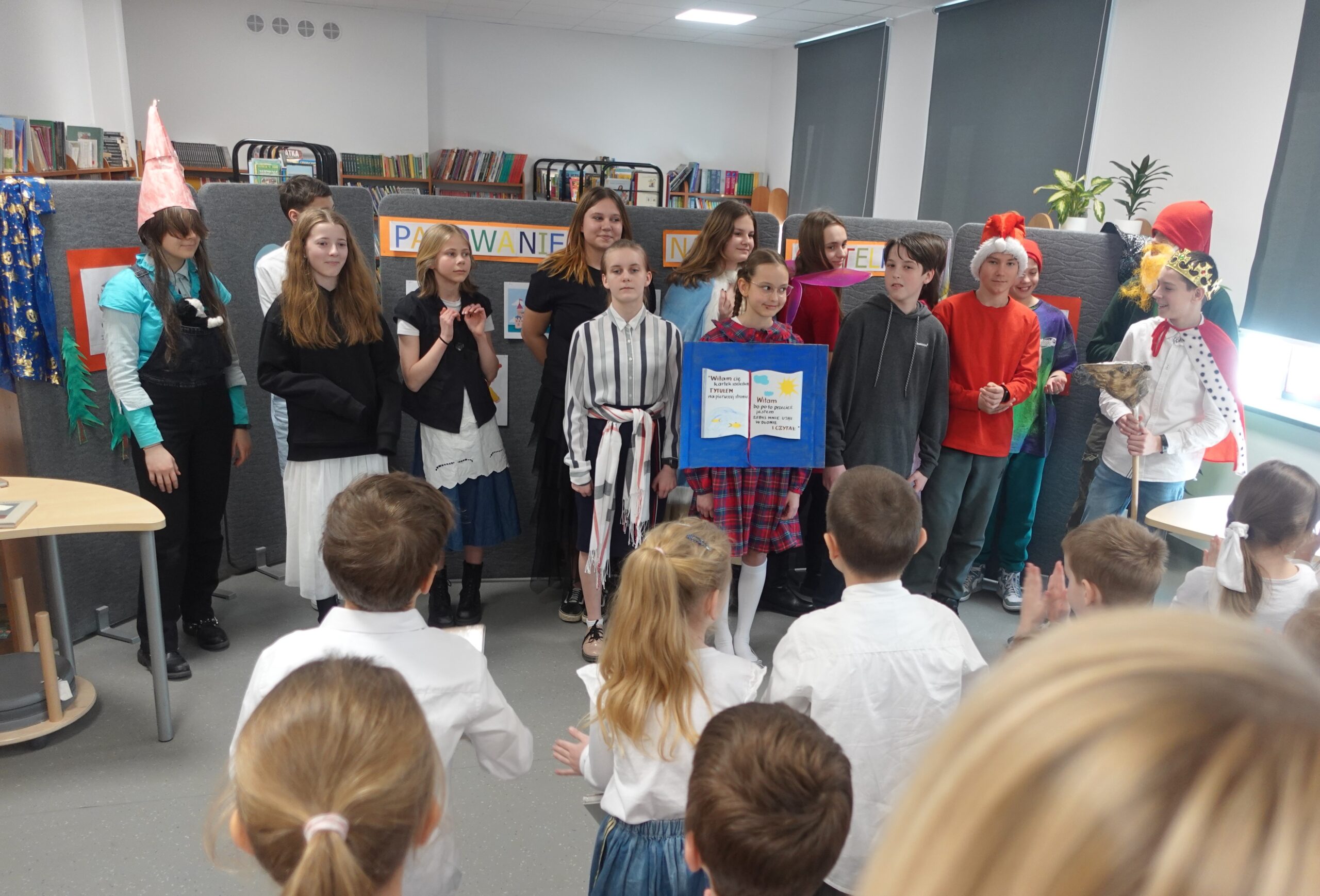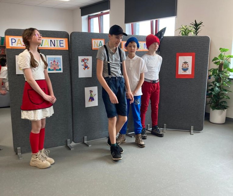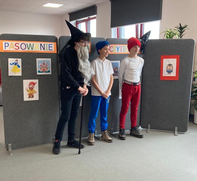 W dniach 23 i 27 lutego 2023 roku w bibliotece szkolnej odbyło się pasowanie pierwszoklasistów na czytelników. Uroczystość uświetnił występ uczniów klas VII b i VII c. Widzowie mieli za zadanie odgadnąć, w którą z bajkowych postaci wcielili się ich starsi koledzy.