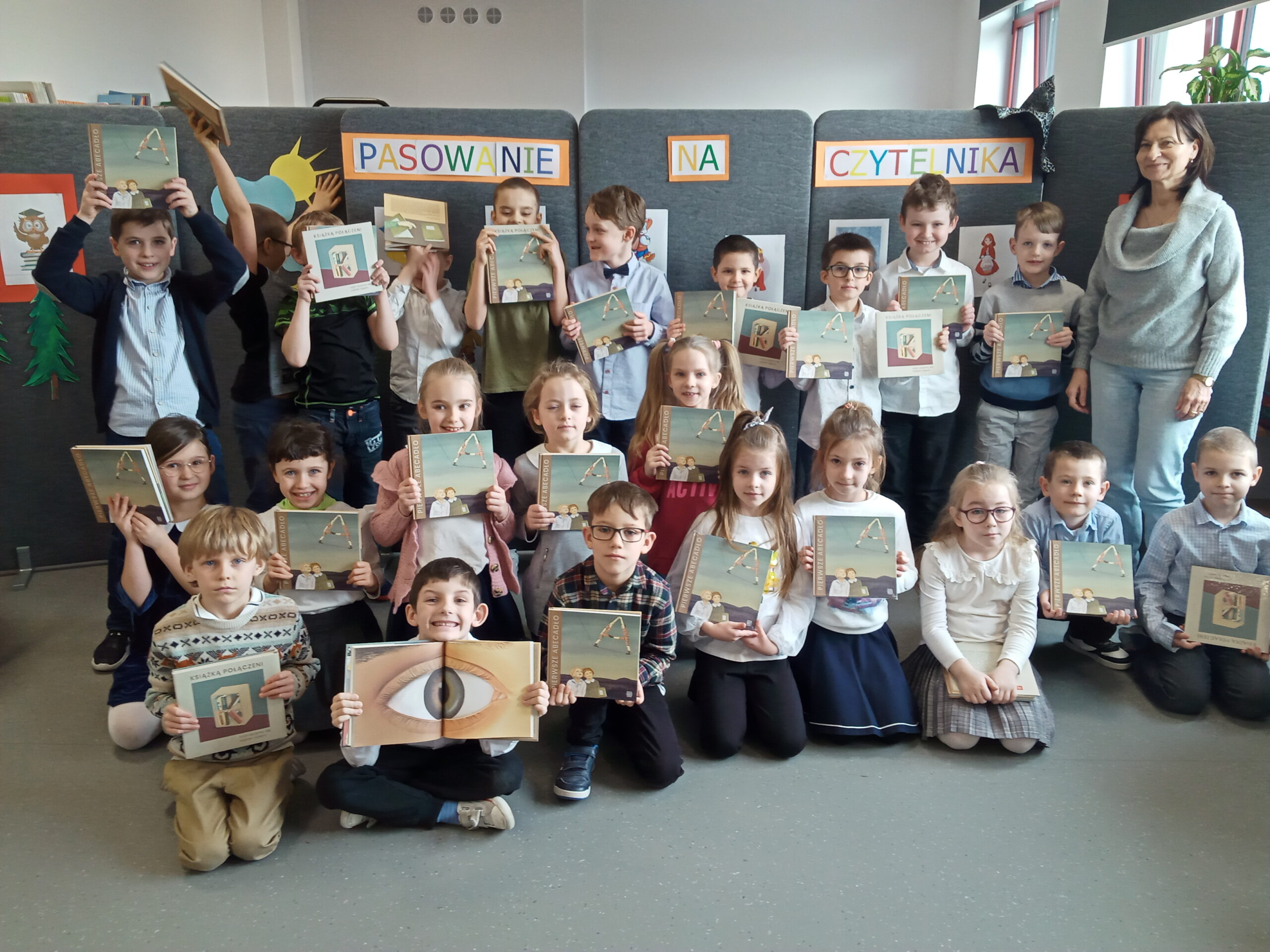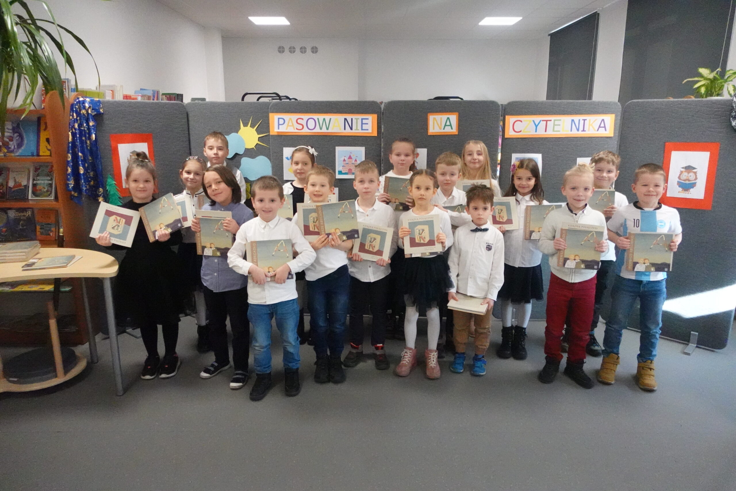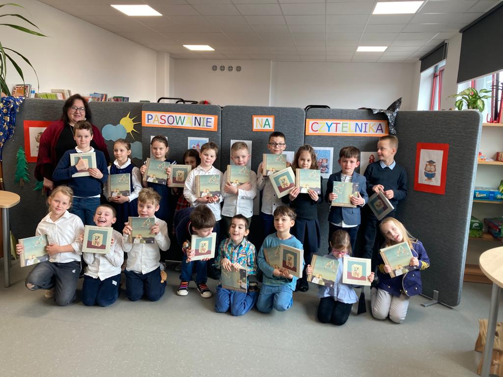Po spektaklu najmłodsi uczniowie naszej szkoły złożyli przysięgę i zostali pasowani na czytelników. Na pamiątkę tej uroczystości każdy nowy czytelnik otrzymał w prezencie Wyprawkę Czytelniczą (w ramach kampanii Instytutu Książki Mała książka – wielki człowiek). Zarówno siódmoklasiści, jak i pierwszoklasiści świetnie spisali się w swoich rolach.