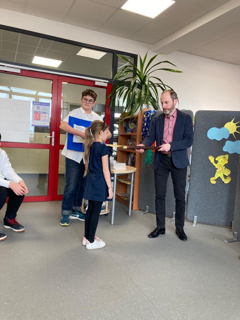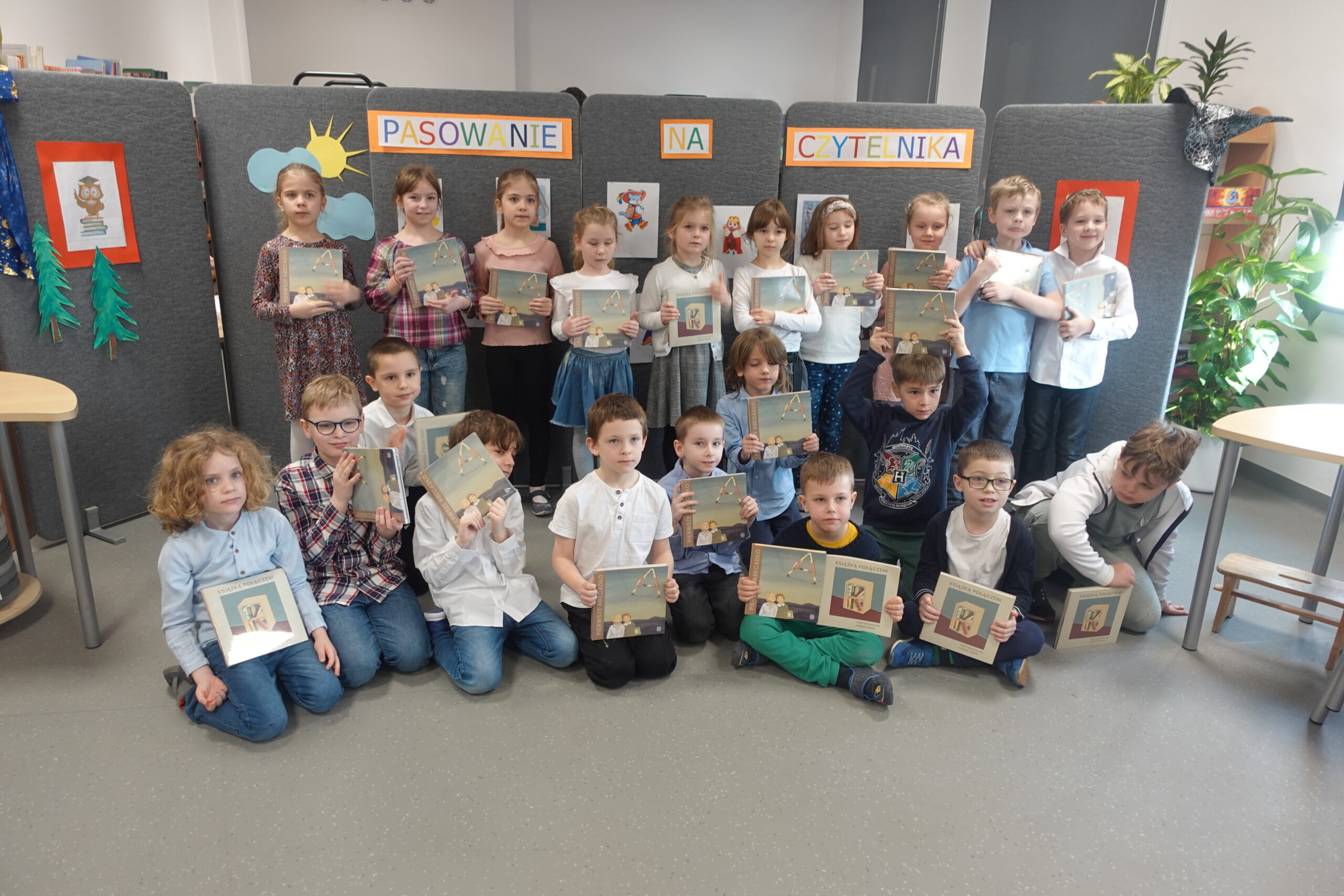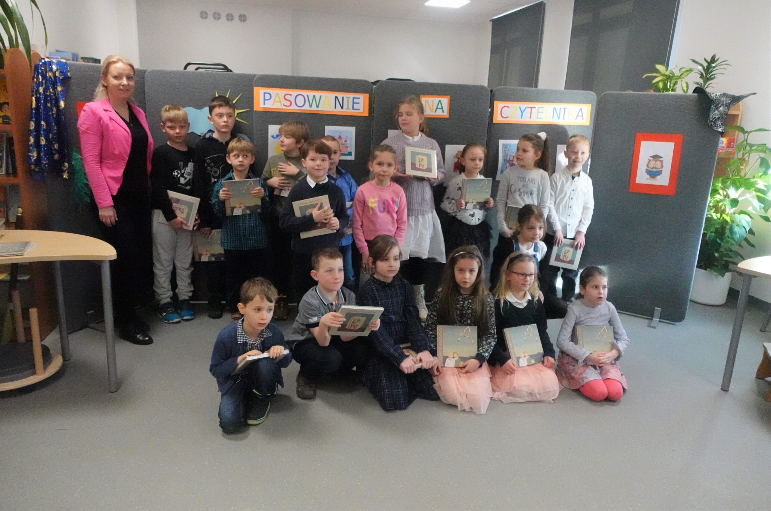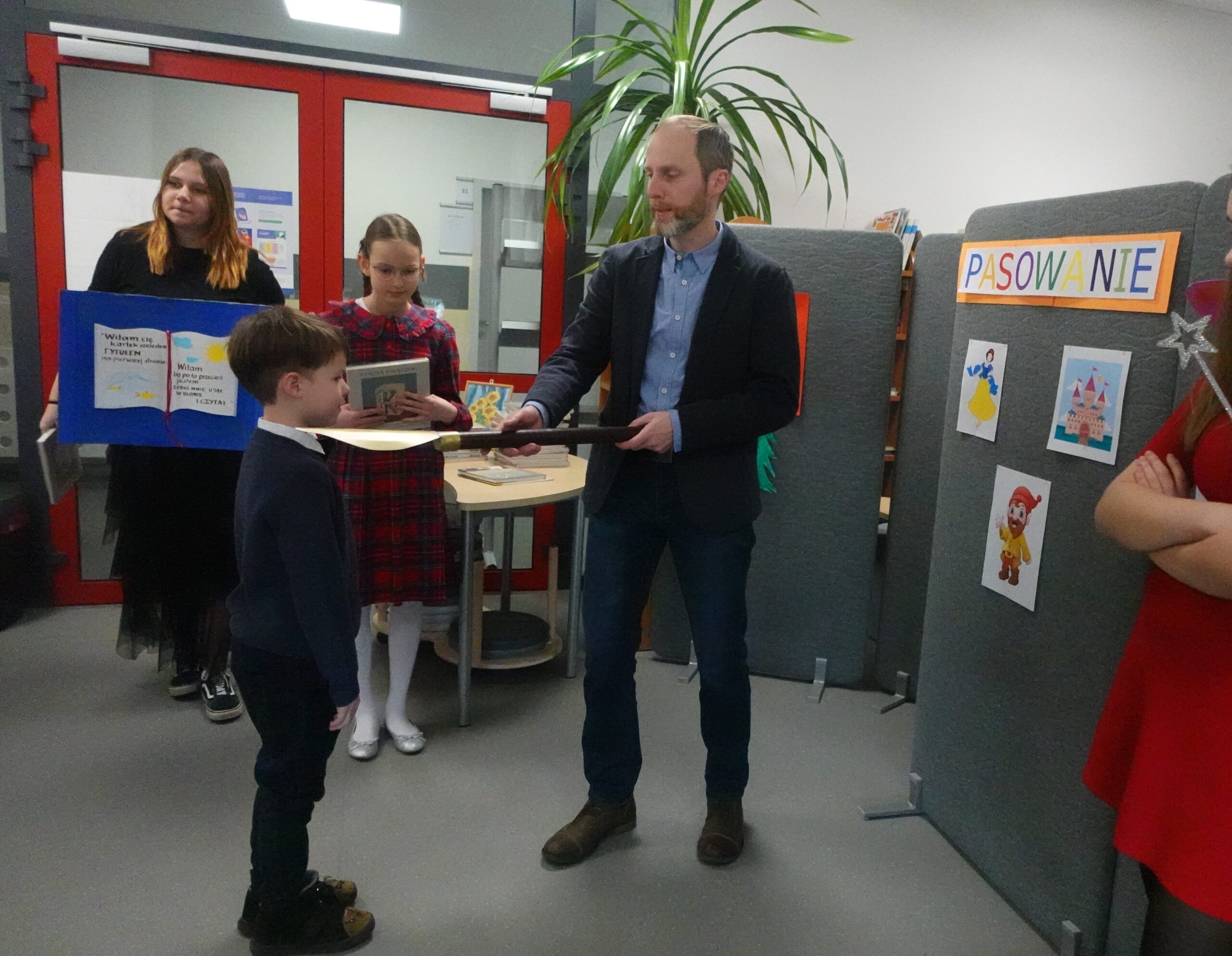 Po spektaklu najmłodsi uczniowie naszej szkoły złożyli przysięgę i zostali pasowani na czytelników. Na pamiątkę tej uroczystości każdy nowy czytelnik otrzymał w prezencie Wyprawkę Czytelniczą (w ramach kampanii Instytutu Książki Mała książka – wielki człowiek). Zarówno siódmoklasiści, jak i pierwszoklasiści świetnie spisali się w swoich rolach.