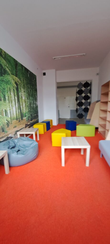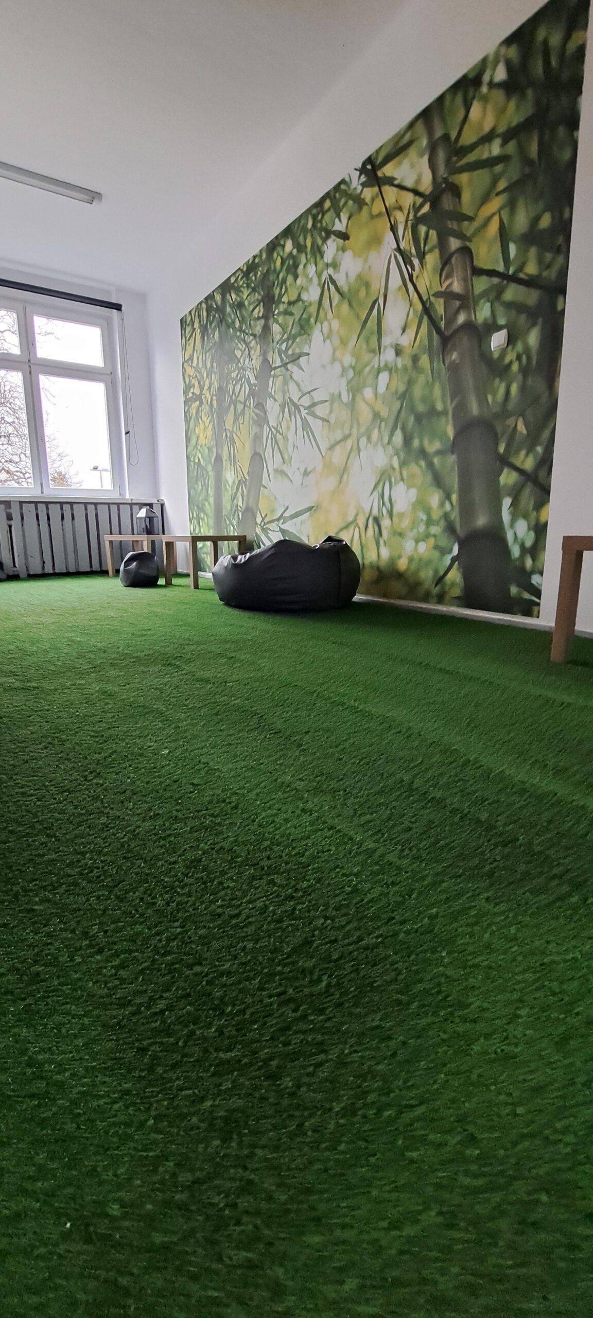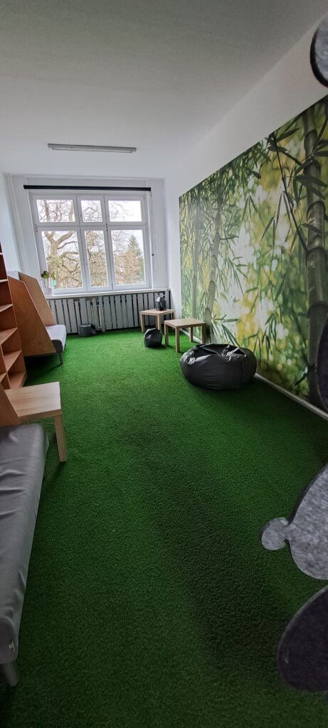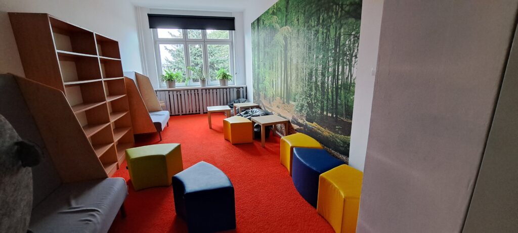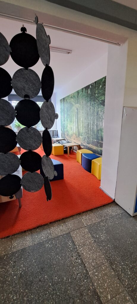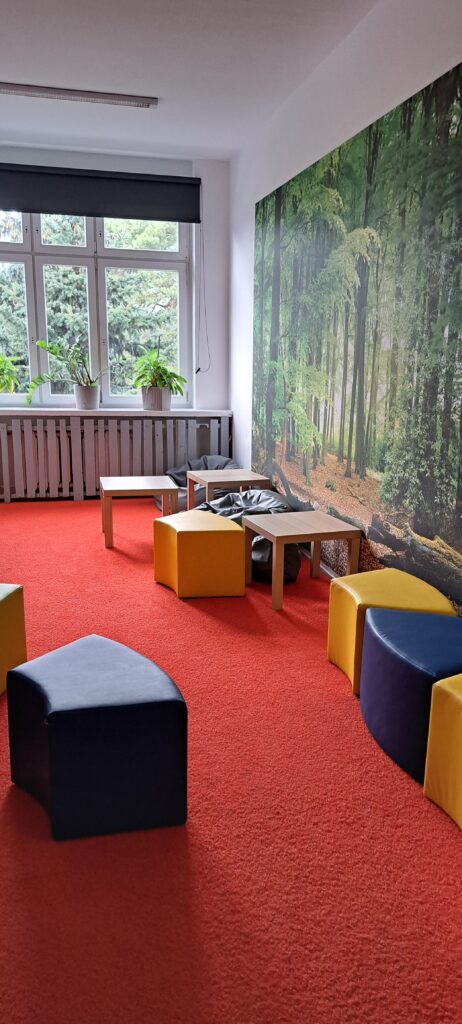 W naszej szkole dbamy, aby uczniowie mieli swoje miejsce, które posłuży relaksowi, integracji i wyciszeniu. Na pierwszym piętrze powstały dwa oddzielne miejsca tzw. strefy relaksu. Strefy wyposażone zostały w bardzo miękką wykładzinę, specjalne pufy, stoliki, fototapety oraz fotele wyciszające.