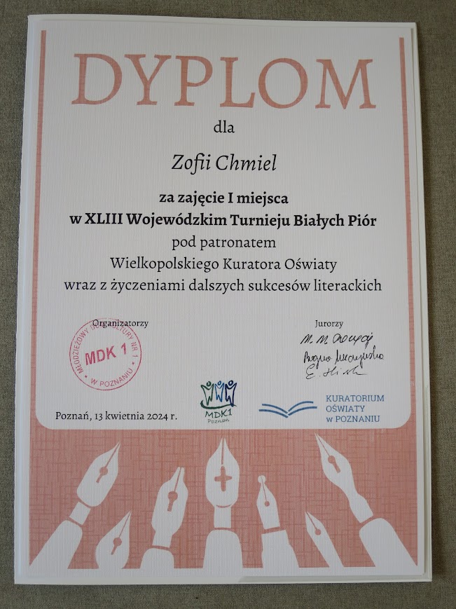 Gratulujemy Zosi i życzymy dalszych sukcesów literackich w wielu różnych konkursach!
