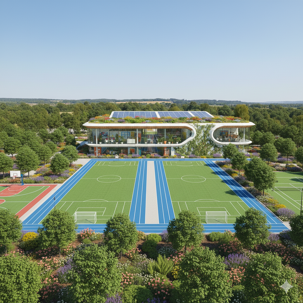 3. Dookoła budynku niech będzie mniejszy ogród i boiska sportowe dla uczniów.