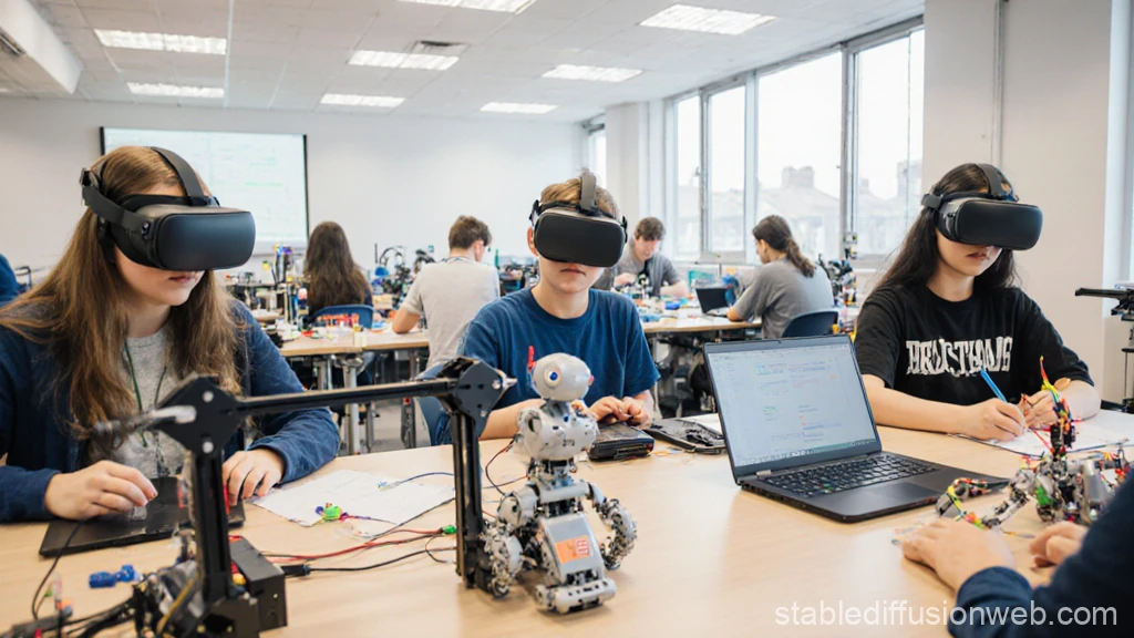 Prompt: Zdjęcie jasnej pracowni, w której uczniowie pracują z drukarkami 3D, robotami, zestawami do kodowania i goglami VR. Wygląda to jak nowoczesny warsztat wynalazcy.
