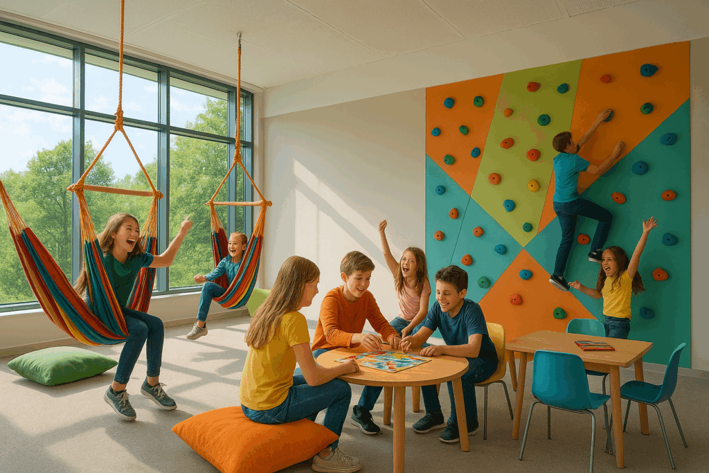 - Wizualizacja dużej sali, gdzie w jednej części są kolorowe hamaki i poduchy do czytania, a w drugiej mała, kolorowa ścianka wspinaczkowa i stół do gier planszowych.