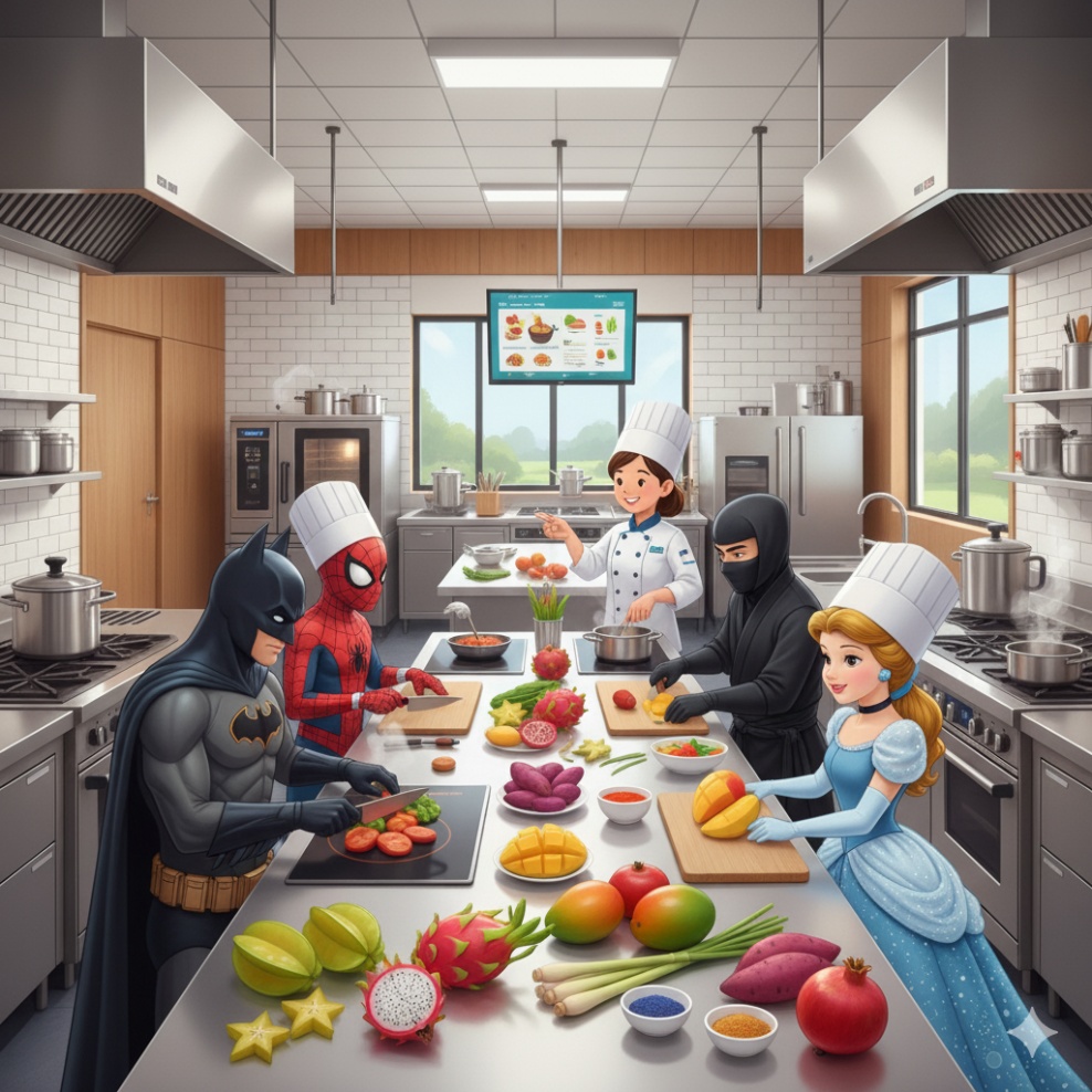- Wygeneruj grafikę prezentującą nowoczesną, profesjonalnie wyposażoną pracownię kulinarną w szkole podstawowej. Młodzież w czapkach kucharskich gotuje pod okiem nauczyciela, a na stole widać egzotyczne składniki.