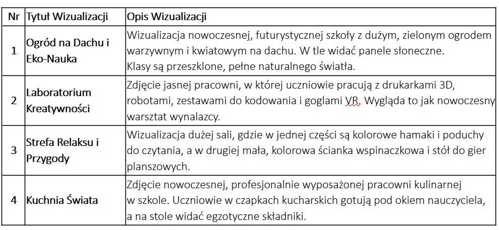 Przygotuj cztery różne wizualizacje (grafiki wygenerowane przez AI), które będą prezentowały Twoją wizję (może być szalona 😉) idealnej szkoły, na grafikach zaprezentuj różne miejsca w szkole, które będą służyć